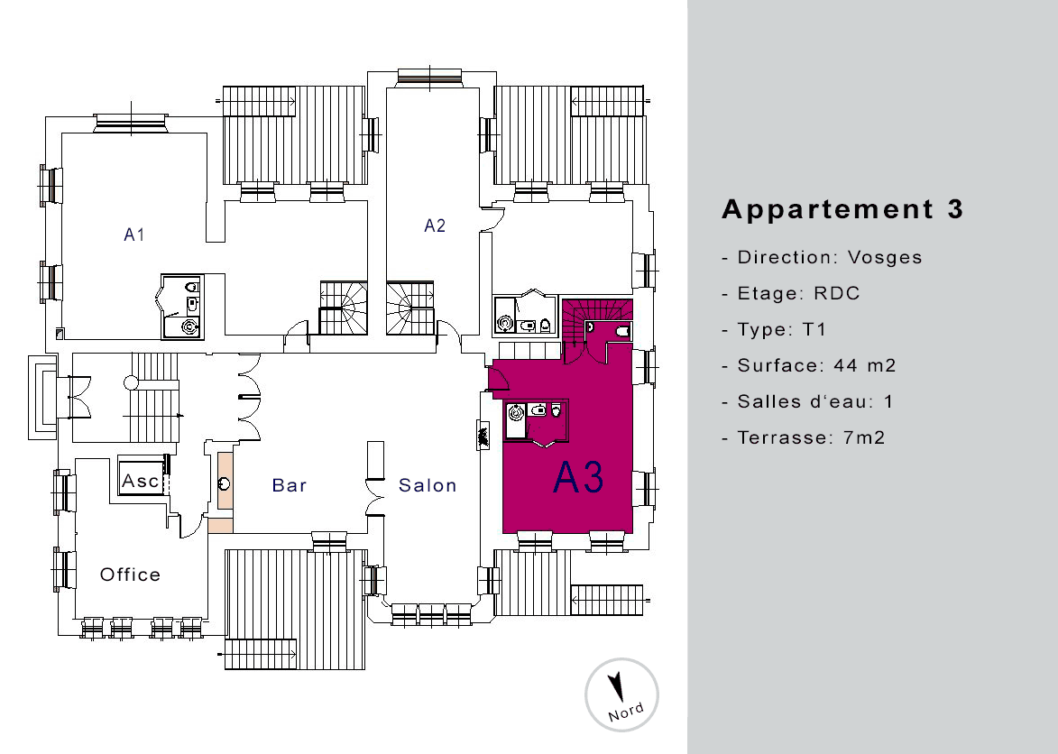 | Appartement A3 | RDC | T1 | 44 | 7m2 | loué | ![]() |