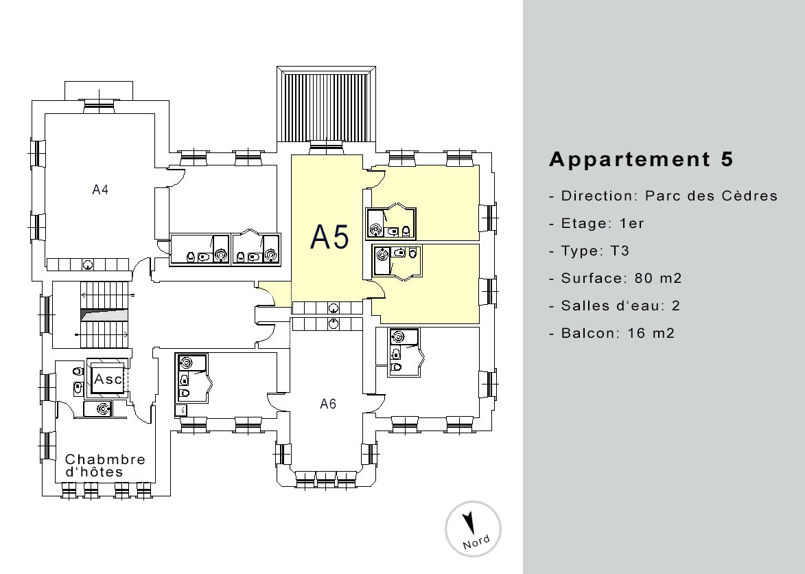 | Appartement A5 | 1 | T3 | 80 | 16m2 | loué | ![]() |