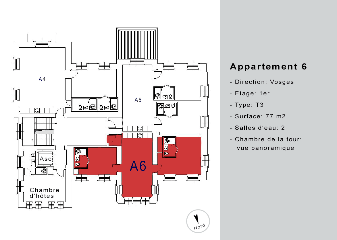 | Appartement A6 | 1 | T3 | 77 | - | loué | ![]() |