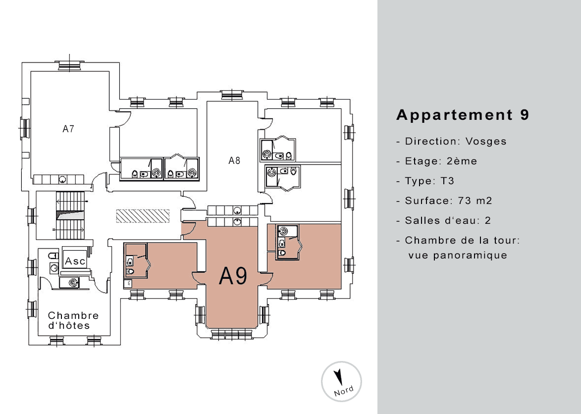 | Appartement A9 | 2 | T3 | 73 | - | loué | ![]() |